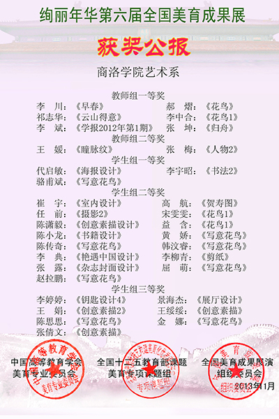 其中,藝術(shù)系被評為“全國藝術(shù)美育先進單位”、“藝術(shù)美育教學成果二等獎”、“藝術(shù)美育教學模范系”。藝術(shù)系3名教師獲得藝術(shù)美育個人教學成果一等獎。藝術(shù)系李中合教授等的作品獲得特等獎2項、一等獎9項、二等獎2項;學生代啟敏等的作品獲得一等獎3項、二等獎15項、三等獎7項。同時,12名師生的作品入選2014故宮太廟全國高校教師(大學生)優(yōu)秀藝術(shù)作品展。