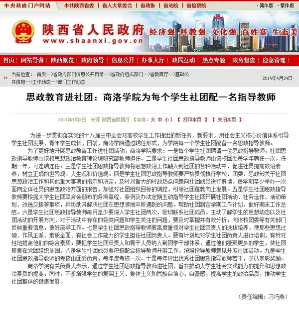 4月3日,陜西省人民政府網(wǎng)站《思政教育進社團:商洛學(xué)院為每個學(xué)生社團配一名指導(dǎo)教師》一文,對我校通過聘任形式,為每一個學(xué)生社團配備一名思政指導(dǎo)教師,進一步貫徹落實黨的十八屆三中全會對高校學(xué)生工作提出的新任務(wù)、新要求,用社會主義核心價值體系引導(dǎo)學(xué)生社團發(fā)展、青年學(xué)生成長進行了報道。(http://www.shaanxi.gov.cn/0/xxgk/1/2/4/22/35/39/124/37505.htm)