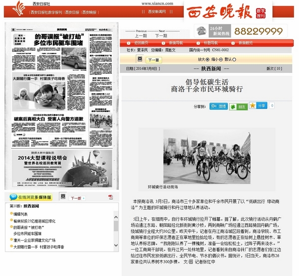 《西安晚報》3月6日報道了我校學(xué)子服務(wù)地方經(jīng)濟社會發(fā)展,積極參與商洛市“低碳出行 綠動商洛”為主題的環(huán)城騎行和丹江綠地認(rèn)養(yǎng)活動。(http://epaper.xiancn.com/xawb/html/2014-03/06/content_280850.htm)