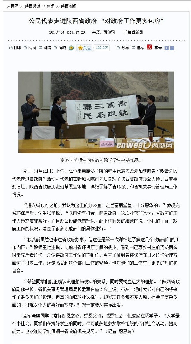 人民網(wǎng)、西部網(wǎng)等4月11日以《公民代表走進陜西省政府 “對政府工作更多包容”》為題,對我校師生走進陜西省政府參觀學(xué)習(xí)進行了報道。(http://sn.people.com.cn/n/2014/0411/c190208-20979066.html)