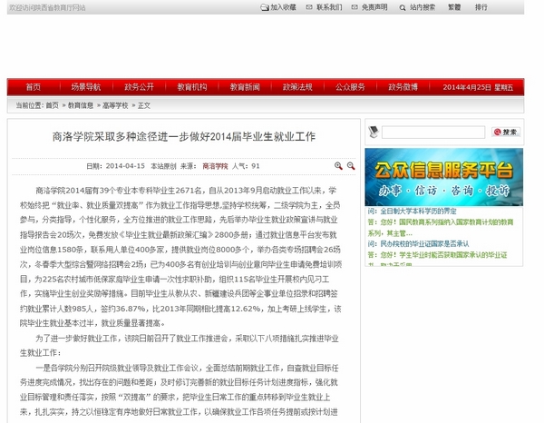截至4月25日,自2014年以來,陜西省教育廳網(wǎng)站共報道我校新聞共15條,平均每周都有1條新聞在省教育廳網(wǎng)站發(fā)布。其中,4月份共有6條報道我校,平均每4天就有1條。4月15日,省教育廳《商洛學(xué)院采取多種途徑進一步做好2014屆畢業(yè)生就業(yè)工作》一文對我校就業(yè)工作進行報道。(http://www.snedu.gov.cn/jynews/gdxx/201404/15/40791.html)