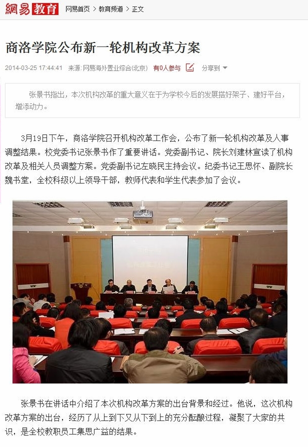 網(wǎng)易教育頻道以《商洛學(xué)院公布新一輪機構(gòu)改革方案》為題,對我校機構(gòu)改革進行了報道。(http://edu.163.com/14/0325/17/9O6UDM9V00294IJT.html)
