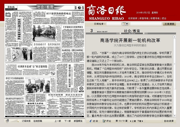 《商洛日報》3月27日以《商洛學(xué)院開展新一輪機構(gòu)改革》為題,對我校機構(gòu)改革進行了報道,并對我校10個二級教學(xué)單位進行連續(xù)報道介紹。(http://eslrb.slrbs.com/slrb/20140327/)