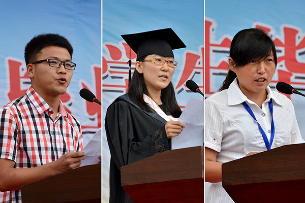 畢業(yè)生代表、經(jīng)濟(jì)與管理學(xué)院會(huì)計(jì)學(xué)專業(yè)2010級(jí)李真回憶了在校的四年光陰,對(duì)學(xué)校給自己帶來的種種收獲與感動(dòng)表示真誠的感謝。生物醫(yī)藥與食品工程學(xué)院2011級(jí)學(xué)生劉淵代表在校生對(duì)畢業(yè)生送上了美好的祝愿,并代表全體在校生表達(dá)了勤勉學(xué)習(xí)的決心。
