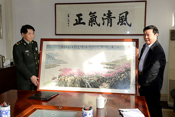 張景書代表我校向解放軍西安政治學院贈送了一幅國畫《江岸紅雨》,寓意兩校合作軍地鋪新章,雨水化真情。李昆明向我?;刭浟私夥跑娢靼舱螌W院水晶紀念版?;铡⒔峙c李昆明分別代表兩校簽署了合作框架協(xié)議書。