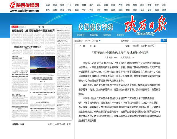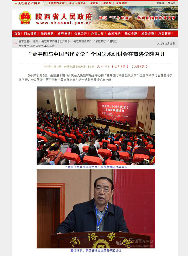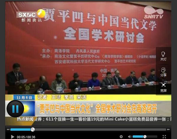 陜西廣播電視臺(tái):11月8日陜西一套《第一新聞(午間播報(bào))》欄目http://www.snrtv.com/content/2014-11/08/content_11808462.htm#(點(diǎn)擊該網(wǎng)絡(luò)鏈接,查找該頁面下方第13個(gè)新聞視頻《“賈平凹與中國當(dāng)代文化”全國學(xué)術(shù)研討會(huì)在商洛召開》)