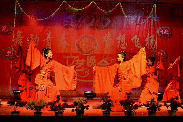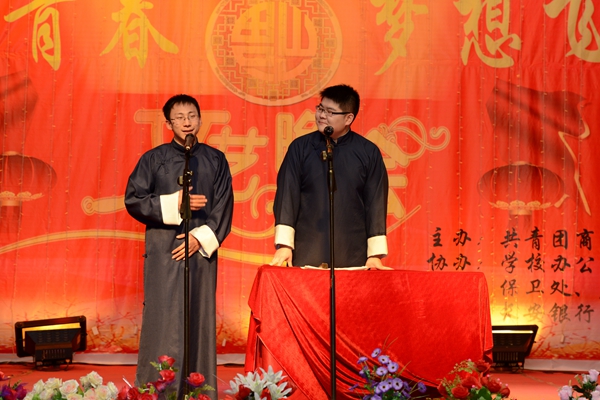 當(dāng)晚的大學(xué)生活動(dòng)中心張燈結(jié)彩,喜氣洋洋,洋溢著歡快的節(jié)日氣氛。晚會(huì)在《讓我們舞起來》歌伴舞的精彩表演中拉開序幕,歌舞、相聲、小品、魔術(shù)、朗誦等16個(gè)形式多樣、精彩紛呈的節(jié)目贏得了臺(tái)下觀眾們的陣陣喝彩。其中,由街舞學(xué)社選送的舞蹈《keep On Dancing》,用動(dòng)感的舞步和滑稽的肢體語言顯示了同學(xué)們豐富多彩的校園生活和活潑陽光的青春風(fēng)采;漢服學(xué)社的同學(xué)們邁著輕快靈動(dòng)、曼妙翩躚舞姿,用一支《重回漢唐》展示了漢代文化的博大精深;相聲《學(xué)富五車》語言詼諧幽默,表演者們精彩的表演贏得了全場(chǎng)熱烈的掌聲;被同學(xué)們冠以“樓姨”昵稱的宿舍管理員用一場(chǎng)《歡樂草原》的舞蹈將晚會(huì)氣氛的推向高潮。藝術(shù)學(xué)院的五位老師一首富有戲劇性的歌曲聯(lián)唱,展現(xiàn)了我校老師嚴(yán)肅又不失活潑的精神風(fēng)貌。