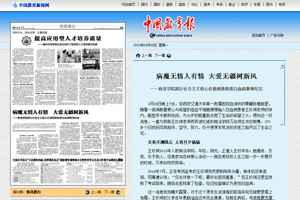 3月30日,《中國教育報》第8版以《病魔無情人有情 大愛無疆樹新風》為題,對我校踐行社會主義核心價值觀救助患白血病教師王珍琪系列活動進行了報道。該文一經(jīng)刊發(fā),新華網(wǎng)、中國網(wǎng)等全國各大媒體紛紛轉(zhuǎn)載,在社會上引起了強烈反響。