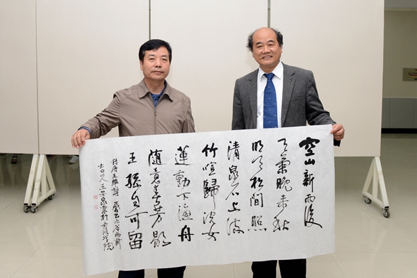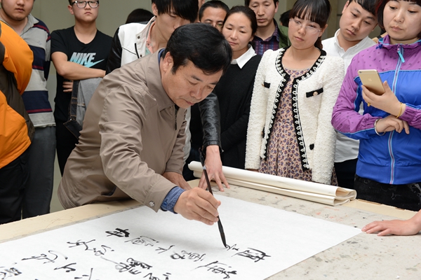 在我校師生的邀請下,王安泉教授在現(xiàn)場揮毫指導(dǎo),親自示范,傳授書法寫作的技巧。王教授行筆不激不厲、揮灑自如、氣度非凡,贏得了大家的一致好評。
