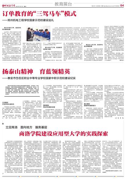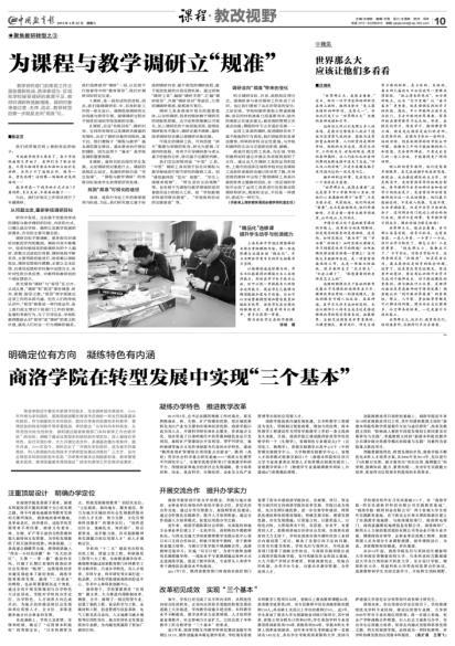4月21日,《中國教育報》在第4版《教育展臺》專題版,刊發(fā)了校黨委書記張景書、校長劉建林撰寫的文章《商洛學(xué)院建設(shè)應(yīng)用型大學(xué)的實踐探索》,專題報道了我校的辦學(xué)目標與定位、建設(shè)應(yīng)用型大學(xué)的實踐與探索、辦學(xué)成果與辦學(xué)特色;4月22日,《中國教育報》在第10版《課程周刊》專題版,刊發(fā)了《商洛學(xué)院在轉(zhuǎn)型發(fā)展中實現(xiàn)“三個基本”》的專題文章,報道了我校在轉(zhuǎn)型時期教育教學(xué)改革的成果,備受社會關(guān)注。