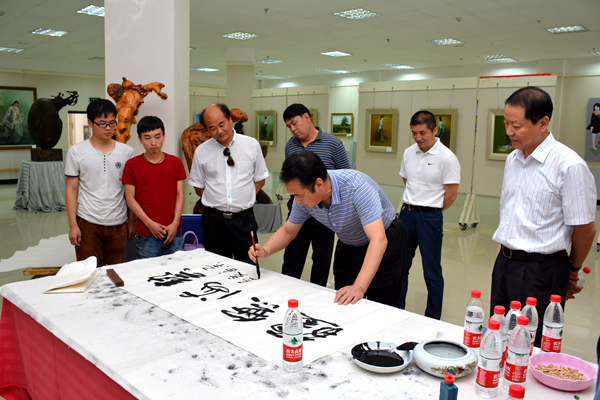 肖玉龍一行考察了我校辦學(xué)成就展廳、陜西省尾礦資源綜合利用重點(diǎn)實(shí)驗(yàn)室、秦嶺植物標(biāo)本陳列室商洛文化暨賈平凹研究中心、商洛紅色文化資料館、藝術(shù)展廳等處。在藝術(shù)展廳,陜西省外經(jīng)貿(mào)實(shí)業(yè)集團(tuán)副總經(jīng)理呂軍政還揮毫潑墨,為藝術(shù)學(xué)院題字《藝海無疆》。