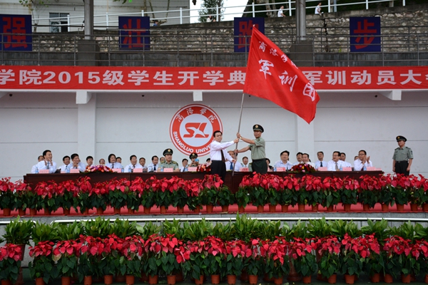 驕驕學(xué)子,今登堂明入室,星夜兼程圓好夢;巍巍黌門,才送往又迎來,躬耕不輟育國魂。9月8日,我校隆重舉行2015級學(xué)生開學(xué)典禮暨軍訓(xùn)動員大會。校領(lǐng)導(dǎo)張景書、劉建林、王思懷、魏書堂、彭虎軍、范新會、劉寶盈,解放軍西安政治學(xué)院黨委常委、院務(wù)部部長邱仕偉大校,解放軍西安政治學(xué)院政治部副主任張新軍大校,解放軍西安政治學(xué)院軍事系教授、學(xué)生軍訓(xùn)團團長劉京生大校,商洛市人民政府副秘書長宋奇志出席了大會。校黨委書記張景書向承訓(xùn)教官授2015級學(xué)生軍訓(xùn)團團旗,校黨委副書記、校長劉建林作了重要講話。大會由校黨委副書記彭虎軍主持。各院部黨政負責(zé)人、各職能部門負責(zé)人與2015級新生參加了大會。