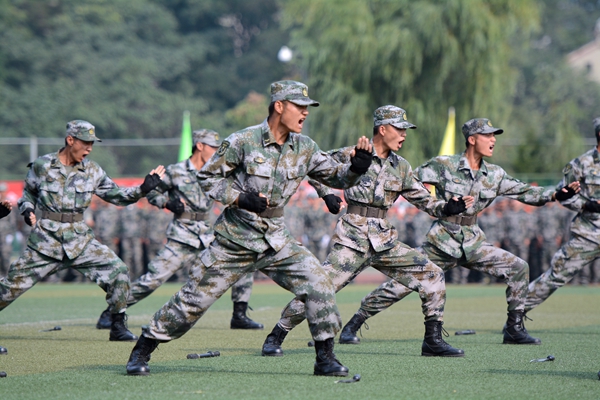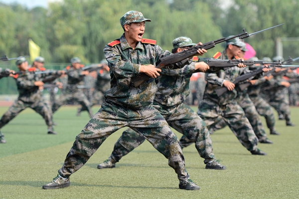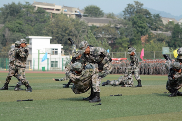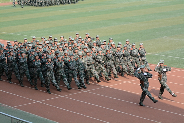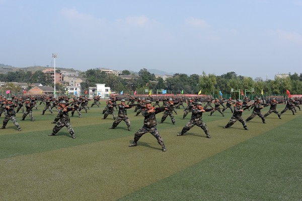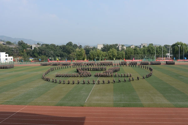 軍訓(xùn)團(tuán)各連組成持槍方陣、刺刀方陣、衛(wèi)生兵方陣等25個受閱方陣進(jìn)行了分列式表演。同學(xué)們口號嘹亮、動作整齊、步伐穩(wěn)健、英姿颯爽,以嚴(yán)整的軍容軍姿依次通過主席臺,充分展現(xiàn)了我校學(xué)生的精神風(fēng)貌。分列式結(jié)束后,我校學(xué)生進(jìn)行了刺殺操、花樣隊(duì)列和軍體拳匯報表演。男子刺殺操動作整齊利落、殺氣騰騰,展示了壓倒一切敵人的英雄氣概。伴隨著《強(qiáng)軍戰(zhàn)歌》的激揚(yáng)旋律,300名女兵進(jìn)行了花式隊(duì)列表演,她們排出了巨大的“70”“1945 2015”字樣,紀(jì)念抗日戰(zhàn)爭暨世界反法西斯戰(zhàn)爭勝利70周年,表達(dá)我校學(xué)生“銘記歷史、緬懷先烈、珍愛和平、開創(chuàng)未來”的堅(jiān)定信念;在校歌《正道直行做棟梁》的旋律中,同學(xué)們又?jǐn)[出了我校?;盏牧Ⅲw造型,引來現(xiàn)場熱烈的掌聲。由720人表演的軍體拳動作精煉、節(jié)奏分明、套路連貫、氣勢磅礴、喊殺聲震天,贏得了現(xiàn)場陣陣熱烈的掌聲。軍訓(xùn)教官也進(jìn)行了捕俘拳表演,將現(xiàn)場氣氛推向了高潮。