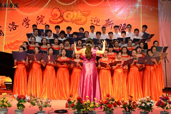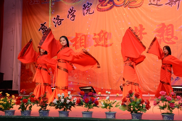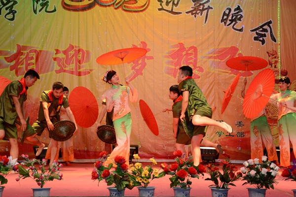 晚會以“心相迎 夢想飛”為主題。在大合唱《游擊隊隊歌》和校歌《正道直行做棟梁》的動人旋律唱中拉開帷幕。整場晚會形式多樣,現(xiàn)代與古典同臺,聲樂與器樂相和,浪漫與詼諧相伴。歌舞、相聲、朗誦、魔術(shù)、樂器聯(lián)奏等精彩的節(jié)目為觀眾呈現(xiàn)了豐盛的視聽盛宴。為紀(jì)念中國人民抗戰(zhàn)暨世界反法西斯戰(zhàn)爭勝利70周年,由藝術(shù)學(xué)院劉威老師帶來的《紅歌聯(lián)唱》將整場晚會渲染出了紅色的氣息,激昂的歌聲與清靈的鋼琴悠揚(yáng)的笛聲相宜相合贏得了一陣陣贊美與掌聲。城鄉(xiāng)規(guī)劃與建筑工程學(xué)院學(xué)生帶來的相聲《地理圖》用毫不遜色于銀幕相聲的精彩表演給整個會場帶來了不息笑聲與不絕的掌聲。由商洛劇團(tuán)的演員帶來的商洛花鼓戲《夫妻觀燈》表現(xiàn)了商洛本地戲曲的魅力,也預(yù)示了我校戲曲學(xué)院的蓬勃發(fā)展。最終,在一首《共筑中國夢》的師生歌伴舞中,整場晚會步入高潮,在陣陣掌聲中落下帷幕。
