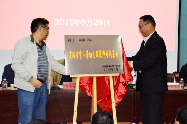 在熱烈的掌聲中,劉寶盈和周春榮分別代表我校和市教育局為“商洛市中小學(xué)幼兒園教師培訓(xùn)基地”揭牌。