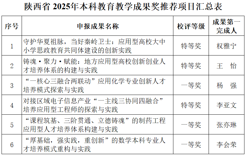 根據(jù)《關(guān)于開展2025年高等教育教學成果獎評審工作的通知》(陜教函〔2025〕688號)文件精神,我校認真組織開展高等教育教學成果獎申報工作,經(jīng)各教學單位推薦,校內(nèi)外專家評審,學校教學工作委員會審定,擬推薦《聚守護華夏祖脈,當好生態(tài)衛(wèi)士:秦嶺腹地大中小學思想政治教育一體化建設(shè)的創(chuàng)新實踐》等6個項目(見下表)申報2025年陜西省高等教育教學成果獎,現(xiàn)予以公示。