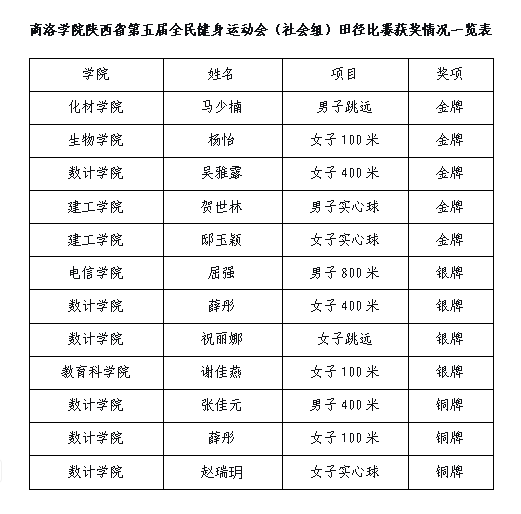 9月14日,陜西省第五屆全民健身運動會(社會組)田徑比賽在山陽縣落幕,在巔峰組比賽中,我校教師桑國鵬獲男子實心球第一名、王品獲男子跳遠第二名、閆蘇榮獲女子100米第二名,牛洋洋獲女子實心球第二名。比賽由體育教學(xué)研究部主任黃顯忠擔任領(lǐng)隊,王健、王品、桑國鵬擔任教練,帶領(lǐng)我校學(xué)生取得5項金獎、4項銀獎、3項銅獎的好成績,充分展現(xiàn)了學(xué)校體育育人的成果和學(xué)子們良好的精神風貌。