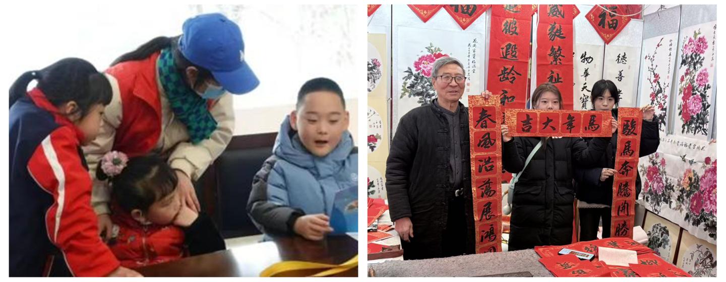 “鄰里守愛筑夢團”等團隊的志愿者們走進西安市周至縣青化鎮(zhèn)、商州區(qū)百順山莊等敬老院,與老人圍坐閑談,為老人梳頭、包餃子,貼上親手書寫的春聯,用陪伴驅散冬日的孤寂。在留守兒童家中,隊員們一對一輔導學業(yè),通過趣味實驗和勵志故事為孩子們種下夢想的種子。在老年大學,“春聯送?!被顒訉鹘y(tǒng)吉祥語與新時代家鄉(xiāng)風貌融入筆墨,讓傳統(tǒng)文化在老少互動中得到傳承,將服務的溫度延伸到基層的每一個角落。