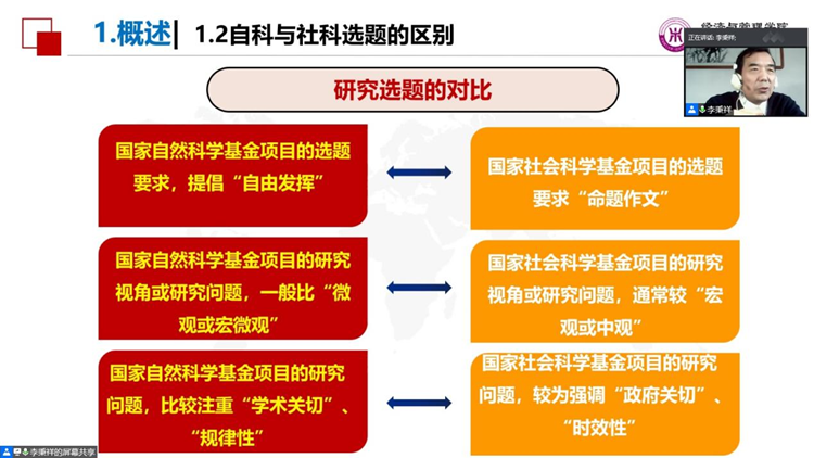 為切實做好2022年國家社會科學(xué)基金、自然科學(xué)基金項目申報工作,有效提升教師申請國家級科研項目的意識,提高教師高層次課題申報能力及申請書撰寫的質(zhì)量,1月5日,經(jīng)濟管理學(xué)院以騰訊會議的方式舉辦2022年國家社科基金、自然科學(xué)基金項目申報經(jīng)驗分享交流會,邀請國家自然科學(xué)基金委同行評審專家、西安理工大學(xué)博士生導(dǎo)師李秉祥教授作經(jīng)驗交流分享。會議由學(xué)院副院長周小婷主持。學(xué)院全體教師參加會議。