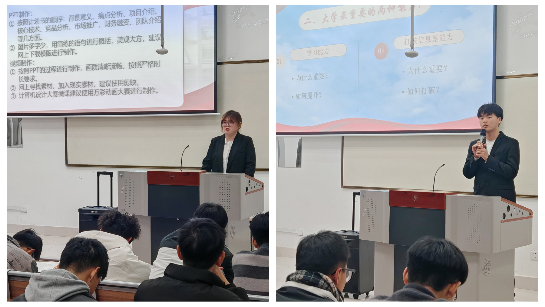 國家獎學(xué)金獲得者衛(wèi)健茹、十佳大學(xué)生吝佳樂分別結(jié)合自身全面發(fā)展的經(jīng)驗,為新生們提供了如何在學(xué)習(xí)、競賽、社團活動等多方面平衡兼顧并取得優(yōu)異成績的思路與方法。他們在講述中流露出來的對學(xué)習(xí)的熱愛和專注深深感染了在場新生。