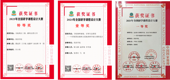 2025 年5月,在“九州杯”全國研學課程設計大賽中,地理專業(yè)許小明教師指導的地理科學專業(yè)團隊(冀延哲、王宇航、趙滕甲、孫詩博、李陽)表現(xiàn)突出 ,團隊共同完成的《走進兩漢三國,解碼自然天書》的研學課程設計,從 2000 多項參賽作品中脫穎而出,一舉奪得成果組特等獎。